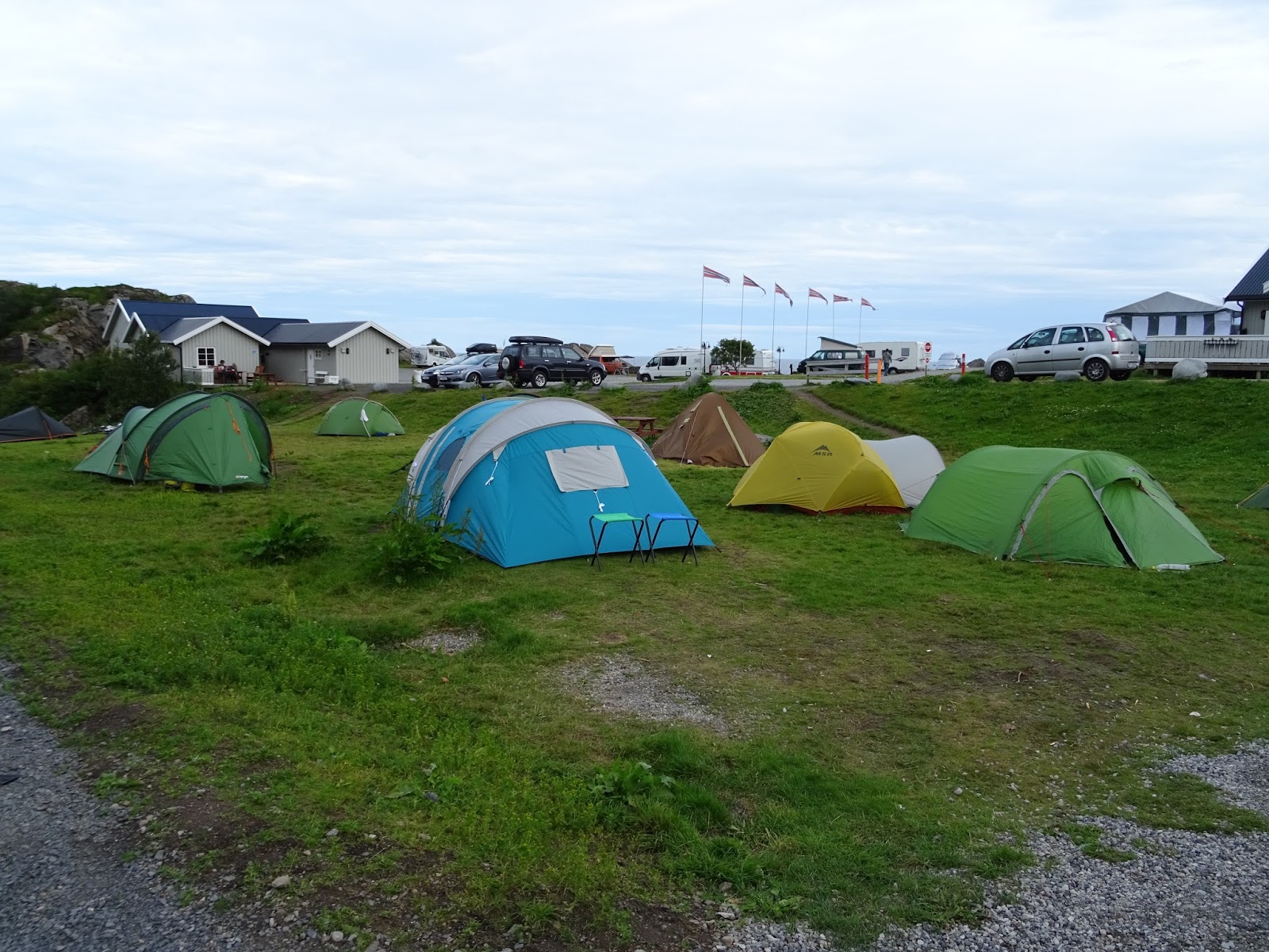 Moskenes Camping is hugely popular. It is one of the few campsites on the southern island. And, due to its location next the ferry terminal. There is a large area of hard standing for campervans and motorhomes, and a few grassy areas for tents. The tents were pitched right on top of each other. Lots of backpackers and a few bikers had already set up their tents. It seemed to be a case of if your tent fits in the space available, take it before someone else does.